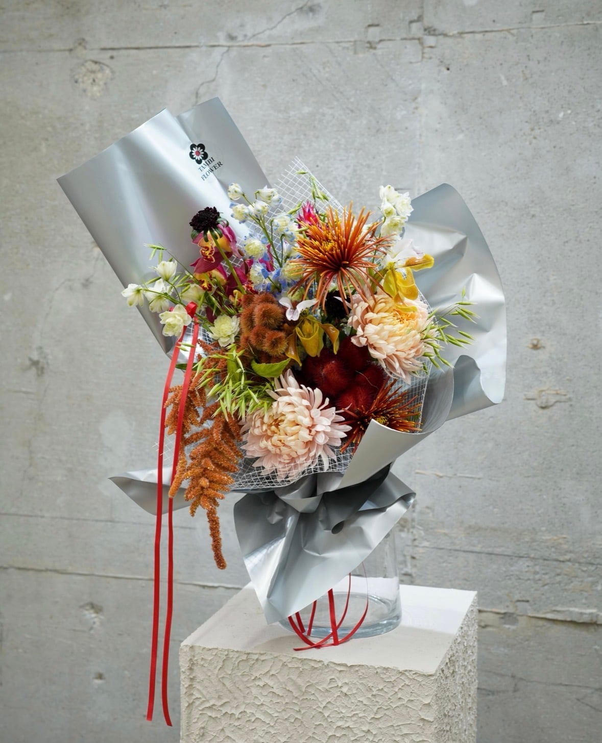 生命力、活力、力強く、そして何よりも植物の持つ美しさを感じ癒してくれるブーケを束ねます。